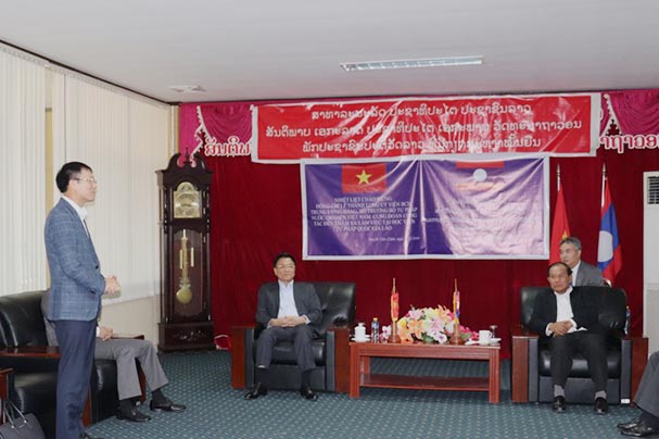 Về phía Việt Nam, Giám đốc Học viện Tư pháp Đoàn Trung Kiên đã cảm ơn 2 Bộ trưởng đã dành những tình cảm quan tâm đặc biệt cho 2 Học viện Tư pháp và Dự án ODA hỗ trợ cho Học viện tư pháp QG Lào. Giám đốc Đoàn Trung Kiên đã báo vắn tắt cho 2 đồng chí Bộ trưởng và đoàn công tác về những kết quả đạt được, những khó khăn vướng mắc, nguyên nhân của những khó khăn vướng mắc liên quan đến việc triển khai Dự án ODA.