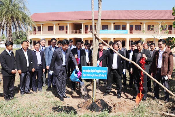 Nhân dịp tới thăm và làm việc với Học viện Tư pháp QG Lào, Bộ trưởng Lê Thành Long và Giám đốc Đoàn Trung Kiên đã trồng cây lưu niệm trong khuôn viên Học viện.