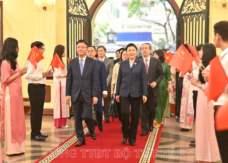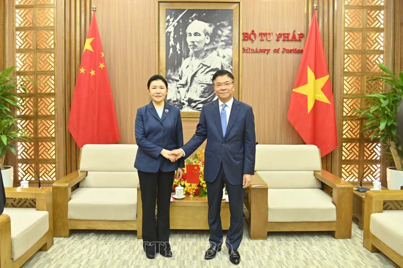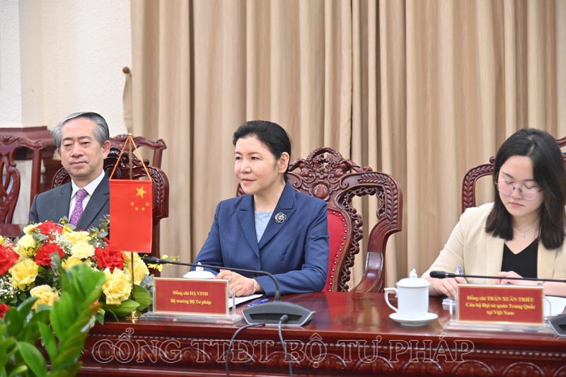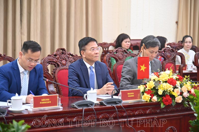 Về quan hệ hợp tác pháp luật và tư pháp Việt Nam - Trung Quốc, hai Bộ trưởng đánh giá cao việc trong thời gian qua, Bộ Tư pháp hai nước đã nỗ lực đàm phán và ký kết được 2 văn kiện hợp tác quan trọng. Ngày 31/10/2022 nhân chuyến thăm chính thức Trung Quốc của Tổng Bí thư Nguyễn Phú Trọng, hai Bộ đã ký Bản ghi nhớ hợp tác trong lĩnh vực pháp luật thay thế cho văn bản hợp tác được ký trước đây là Nghị định thư hợp tác giữa Bộ Tư pháp nước Cộng hòa XHCN Việt Nam và Bộ Tư pháp CHND Trung Hoa năm 1997. Tại Bản ghi nhớ này, hai bên thống nhất trao đổi kinh nghiệm về xây dựng pháp luật, kiểm tra văn bản quy phạm pháp luật và tổ chức thi hành pháp luật; trao đổi kinh nghiệm về: Phổ biến, giáo dục pháp luật; Hòa giải ở cơ sở; Trợ giúp pháp lý; Quản lý luật sư và công chứng viên; Xử lý vi phạm hành chính; Cải cách pháp luật, xây dựng Nhà nước pháp quyền; Ứng dụng công nghệ thông tin trong xây dựng pháp luật, xây dựng và điều hành cơ sở dữ liệu pháp luật; Thúc đẩy thực hiện hiệu quả Hiệp định tương trợ tư pháp về các vấn đề dân sự và hình sự giữa Cộng hòa XHCN Việt Nam và CHND Trung Hoa ký ngày 19/10/1998 tại Bắc Kinh; Phối hợp hoạt động tại các tổ chức, diễn đàn đa phương về hợp tác pháp luật và tư pháp; Khuyến khích việc mở rộng hợp tác pháp luật và tư pháp giữa các Sở Tư pháp địa phương tại khu vực biên giới của hai nước.